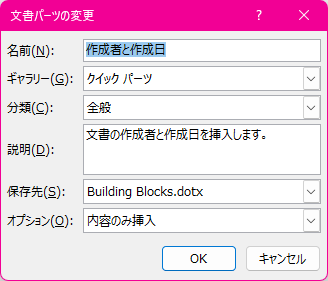 ギャラリー一覧から編集したい項目を右クリックしてショートカットメニューより[プロパティの編集]をクリックすると、[文書パーツの変更]ダイアログボックスが表示されます。文書パーツはすべての要素が含まれていて探すのが難しいため、この方がやりやすいでしょう。