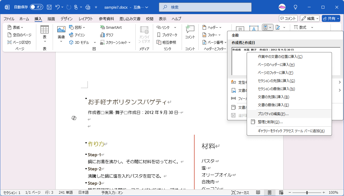 保存したテキストボックスギャラリーや定型句などの文書パーツは必要に応じて編集できます。[挿入]タブの[テキスト]グループの[クイックパーツ]一覧から[文書パーツオーガナイザー]を選択して、編集したい文書パーツを選択して[プロパティの編集]ボタンをクリックします。ギャラリー一覧から目的の文書パーツを右クリックしてショートカットメニューより[プロパティの編集]を選択すると素早く編集できます。