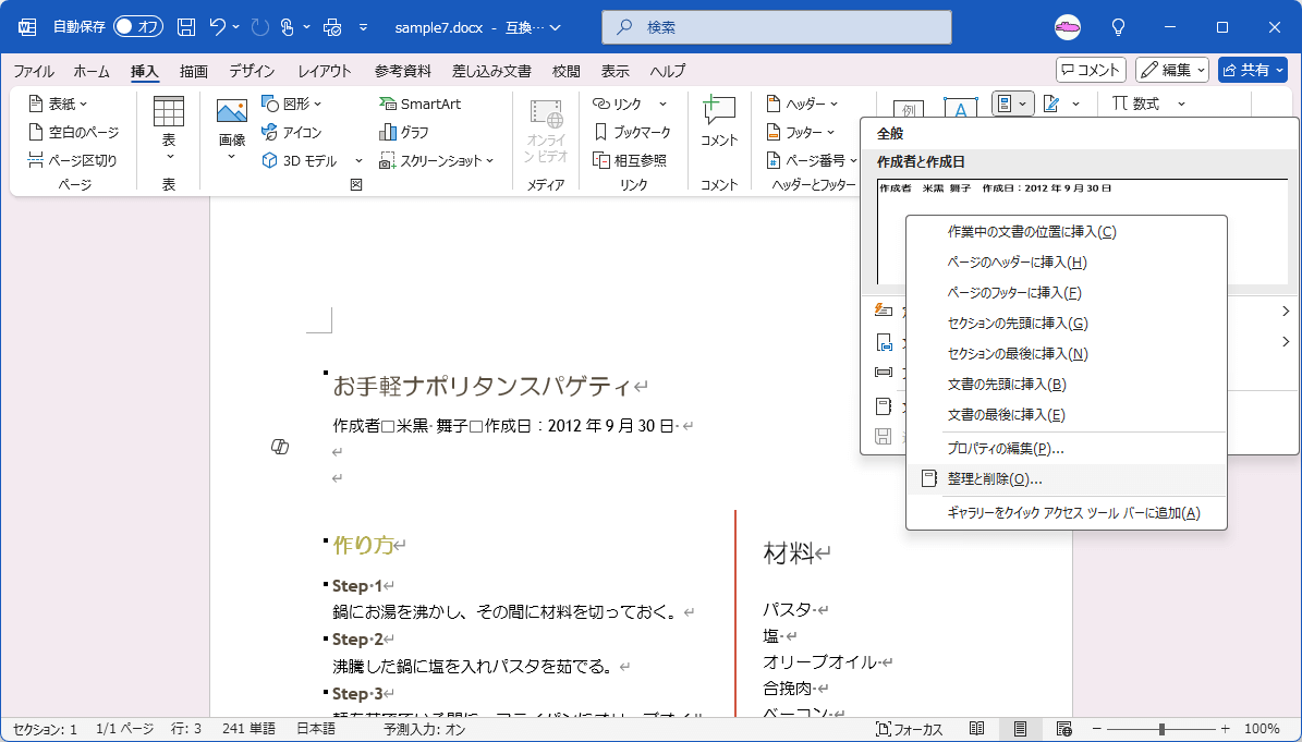 - ギャラリー一覧から目的の文書パーツを右クリックしてショートカットメニューより[整理と削除]を選択します。