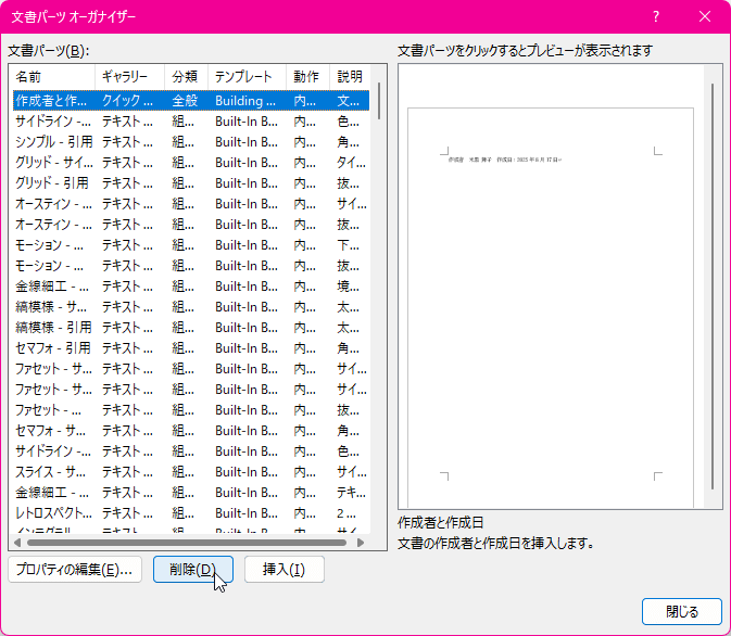 [文書パーツオーガナイザー]ダイアログボックスが表示され、選択した文書パーツが選択された状態になるので、[削除]ボタンをクリックします。