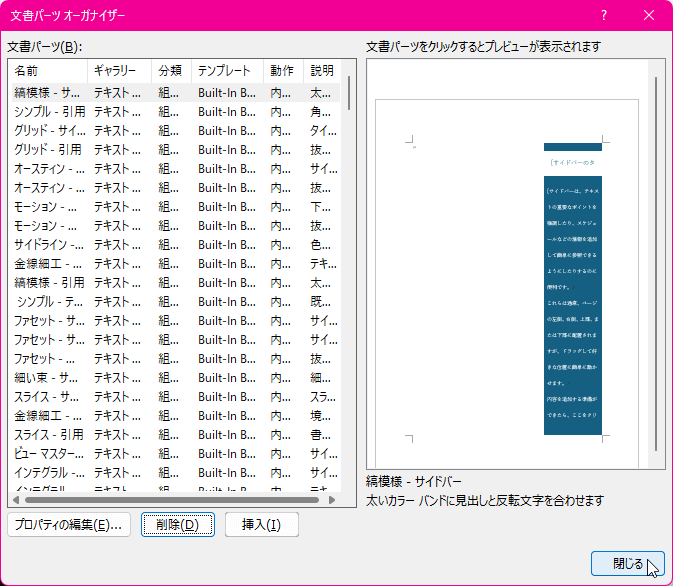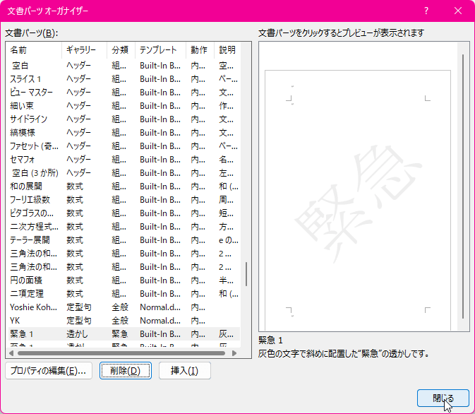 - 文書パーツが削除されたら[閉じる]ボタンをクリックします。