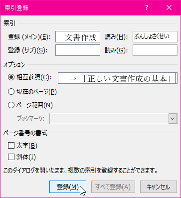 - 対象とする文字列を索引に登録するには[登録]ボタンをクリックします。文書内で使われている同じ文字列すべてに対して索引登録を行う場合は、[すべて登録] をクリックします。