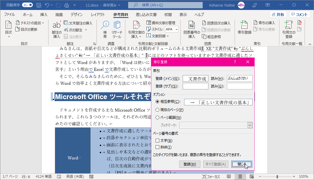 - [参考資料]タブを開き、[索引]グループの[索引登録]をクリックするか、[Alt]+[Shift]キーを押しながら[X]キーを押します。