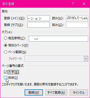 索引を出力するときのページ番号の書式を太字や斜体に設定することもできます。[索引登録]ダイアログボックスの[ページ番号の書式]で、[太字]チェック ボックスまたは[斜体]チェック ボックスをオンにします。