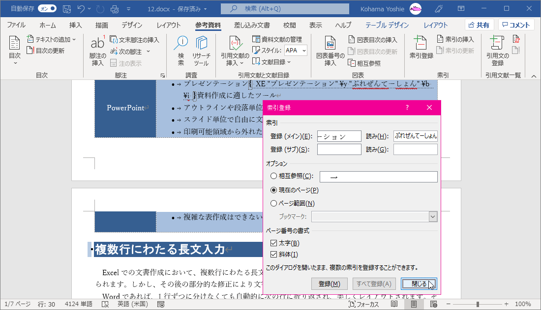 - [参考資料]タブを開き、[索引]グループの[索引登録]をクリックするか、[Alt]+[Shift]キーを押しながら[X]キーを押します。