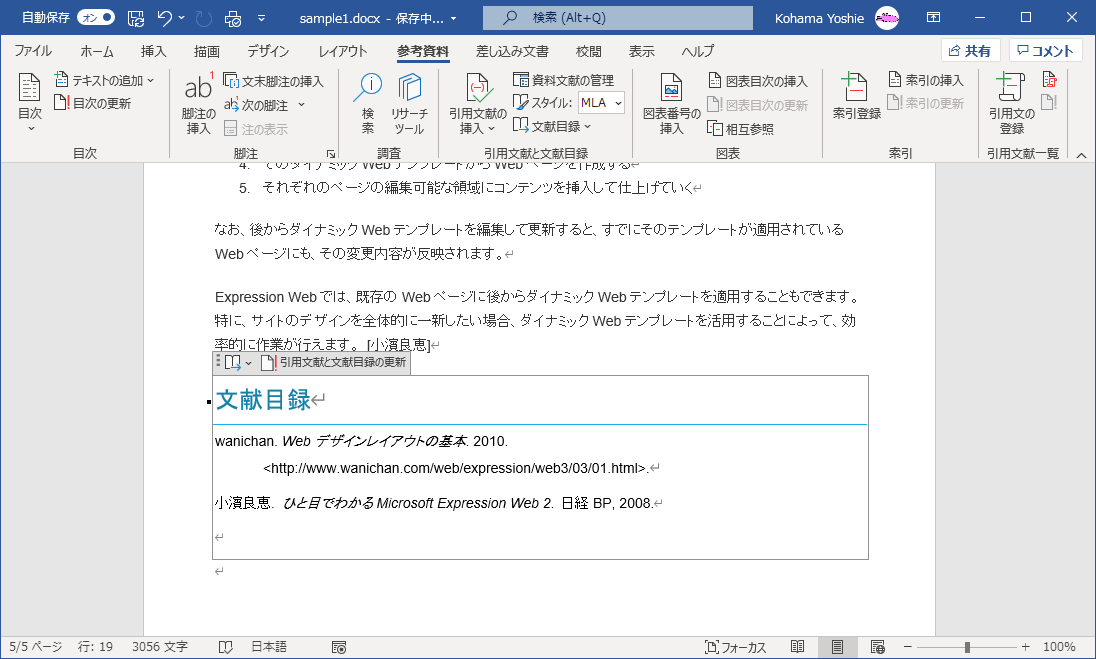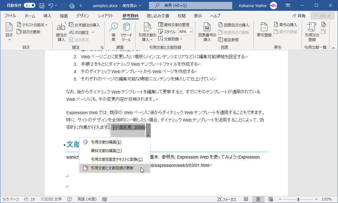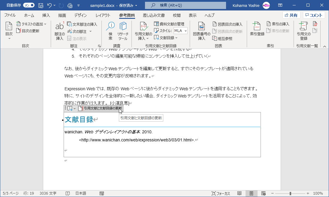 - 追加や更新を行った引用文献のプレスホルダーの▼をクリックし、[引用文献と文献目録の更新]をクリックします。