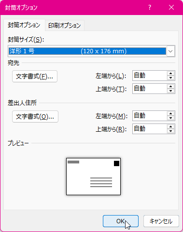 - 変更したい封筒サイズを選択して[OK]ボタンをクリックします。