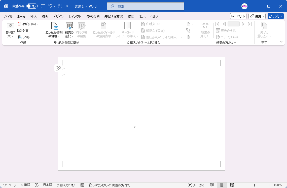 - [差し込み文書]タブの[作成]グループの[封筒]をクリックします。