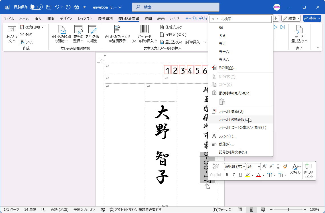 住所録データの番地が漢数字でない場合、縦書きではそのままのデータで流し込まれ、半角英数字が右に90度回転します。縦書きに対応するためにアラビア数字から漢数字に変換するには、そのフィールドを右クリックし、ショートカットメニューより[フィールドの編集]を選択して、[数字を漢数字に変換する]にチェックをつけます。