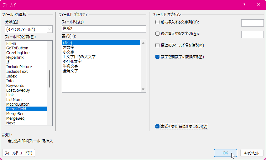 この場合、数字を漢数字に変換するようにフィールドを設定します。