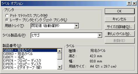 そのあと、ラベルの種類を指定してOKボタンをクリックすると、