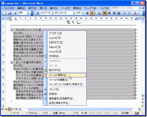 - 目次フィールド内を右クリックして[フィールド更新]をクリックします。