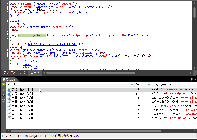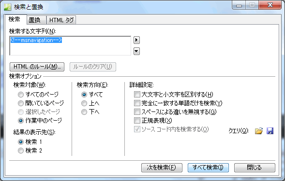 - 共有枠のコメント <!--msnavigation--> をすべて検索します。Ctrlキーを押しながらFを押して[検索と置換]ダイアログボックスを表示し、検索する文字列に<!--msnavigation--> を入力して[すべて検索]ボタンをクリックします。