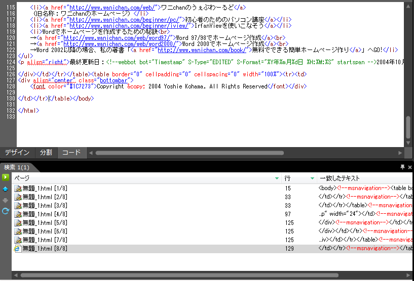 - [検索]パネルに表示された一番上のリスト行をダブルクリックすると、該当する箇所が選択されるので、Deleteキーで消していきます。ダブルクリックすると選択されるのでDeleteキーを押す