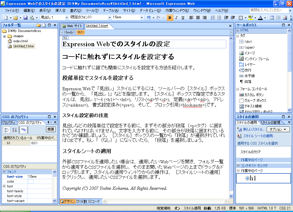 ここでは、標準フォントサイズを1emとした相対フォントサイズで指定します。左の図のようにfont-size欄に、「1.5」と数値を入力し、単位を「em」と指定します。すると、プレビュー画面でその大きさが反映されますので、大きさを確認し、[OK]ボタンをクリックします。 - 見出し1(<h1>)のフォントサイズが変更されました。※通常のh1の大きさは2emです。1.5emは上の図のように、実際のh2と同じ大きさになります。標準文字サイズはh4と通常の段落<p>になります。