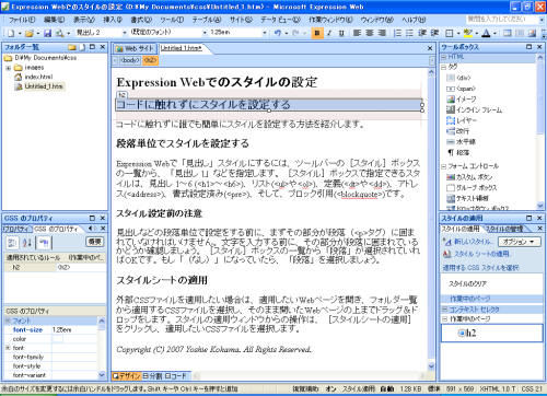- 指定された要素は、下図の左下に表示されている[CSSのプロパティ]作業ウィンドウにて確認できます。設定後に変更したい場合は、[スタイルの変更]ダイアログを開かなくても、この部分の値を直接変更するだけで、変更した値に変更されます。