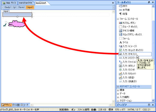 - [ツールボックス]作業ウィンドウから「入力(テキスト)」をデザインビューの挿入先までドラッグします。
