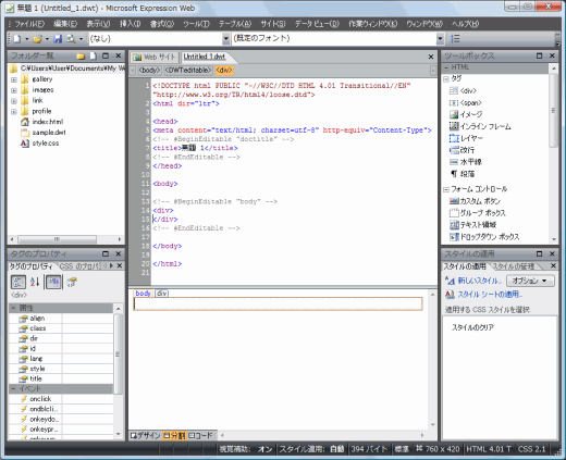 ダイナミックWebテンプレートを作成するには、とりあえず新規Webページを作成してから、[名前を付けて保存]にてファイル形式をダイナミックWebテンプレートとして保存する方法と、ダイナミックWebテンプレートの新規作成の2通りあります。ダイナミックWebテンプレートを新規作成すると、あらかじめ編集可能な領域が設定された真っ白なテンプレートが新規作成されますが、私個人的には前者の方法が一番スムーズに作業が行えると思います。
