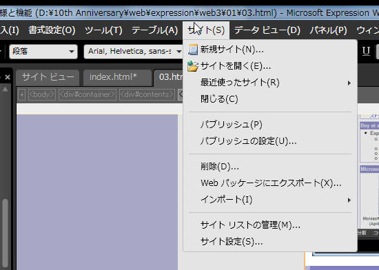 サイトを開く、サイトの発行、サイトの新規作成、Webパッケージにエクスポートやインポートは、従来は[ファイル]メニューにありました。