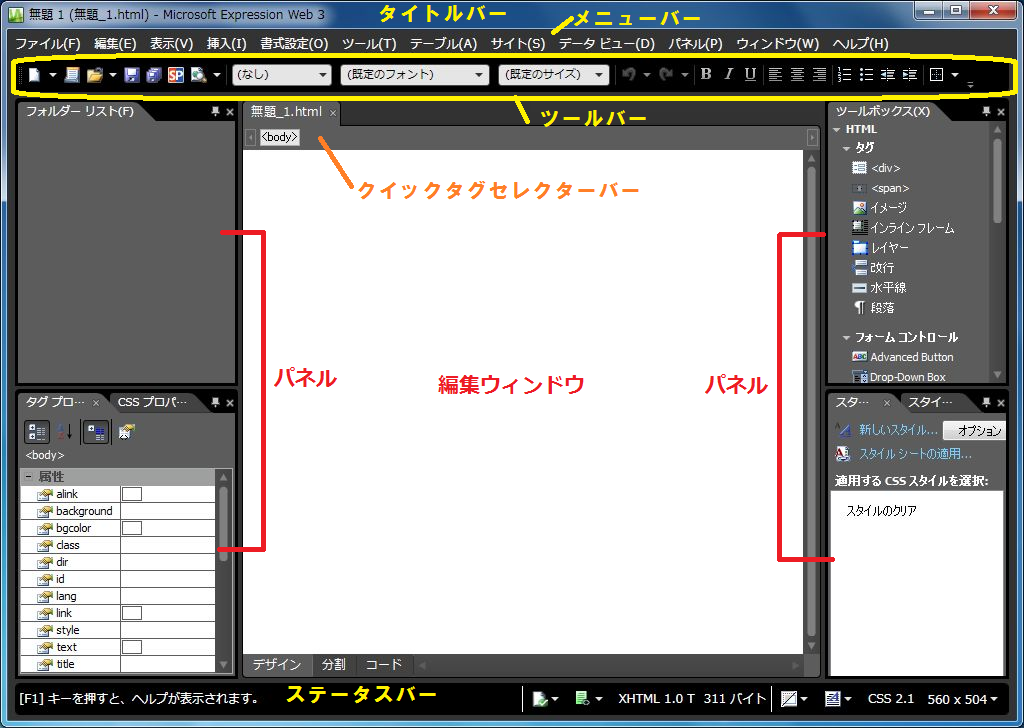 一番上にタイトルバー、その下にメニューバー、ツールバー、画面下にステータスバーがあるのは、どのアプリケーションでも共通です。Expression Web 3から、作業ウィンドウの代わりにパネルが画面の両端、編集ウィンドウの周辺に配置されます。