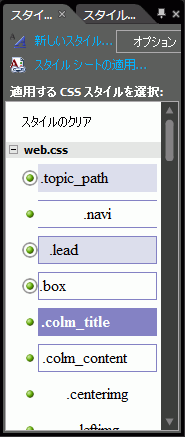 スタイルの適用、変更、名前変更、削除や、外部CSSファイルの適用または適用解除、スタイルのすべての適用部分の選択、スタイルのルール セットを含むコードへの移動を行うことができます。