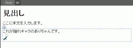 <!DOCTYPE HTML PUBLIC "-//W3C//DTD HTML 4.01 Transitional//EN" "http://www.w3.org/TR/html4/loose.dtd"> <html> <head> <meta content="ja" http-equiv="Content-Language"> <meta content="text/html; charset=utf-8" http-equiv="Content-Type"> <meta name="keywords" content="キーワード1,キーワード2,キーワード3"> <meta name="description" content="このページの説明文を入れます"> <title>このWebページのタイトル</title> </head> <body> <h1>見出し</h1> <p>ここに本文を入力します。</p> <p>これが隠れキャラのありちゃんです。<br> <img alt="ant" height="32" src="/common/images/ant.gif" width="27"> </p> </body> </html>