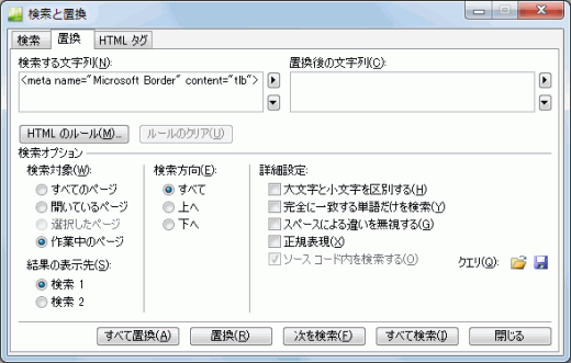 例:<meta name="Microsoft Border" content="tlb"> - 共有枠のコメントを[検索と置換]ツールを使って削除します。
