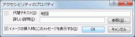 - Expression Webにタスクを切り替えて、挿入先にカーソルを移動し貼り付けると、[アクセシビリティのプロパティ]ダイアログボックスが表示されるので、代替テキストを入力して[OK]ボタンをクリックします。