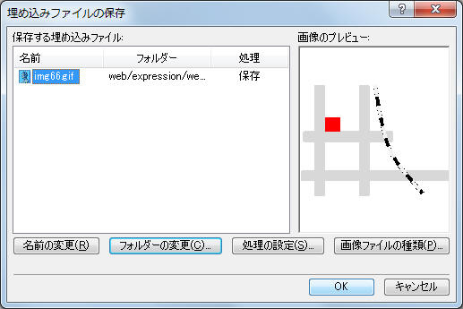 - Webページ保存時に[埋め込みファイルの保存]ダイアログボックスが表示されるので、ファイル名、保存先のフォルダーを指定して[OK]ボタンをクリックします。