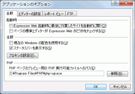 - [アプリケーションのオプション]ダイアログボックスの[全般]タブが開かれるので、[起動時]設定オプションの[Expression Web 起動時に最後に作業したサイトを自動的に開く]のチェックをはずして[OK」ボタンをクリックします。