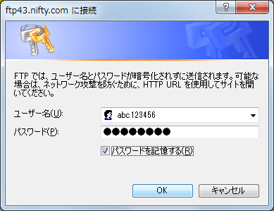 - FTPサーバーに接続する画面が表示されたら、ユーザー名、パスワードを入力して[OK]ボタンをクリックします。