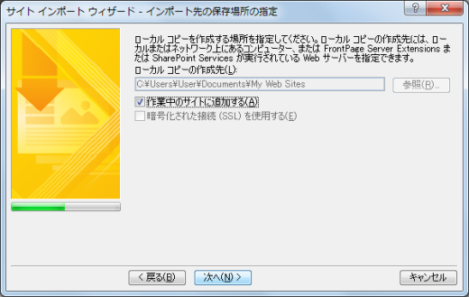 - [ローカルコピーの作成先]ボックスでインポート先の保存場所を確認して、[次へ]ボタンをクリックします。