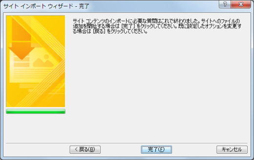- サイトインポートウィザードの完了画面で[完了]ボタンをクリックします。