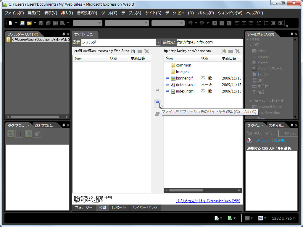 - 中央の[ファイルをパブリッシュ先のサイトから取得]ボタンをクリックすると、作業中のサイトにデータがインポートされます。