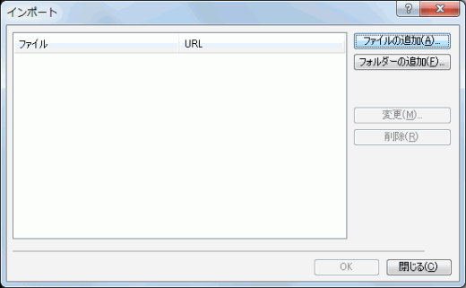 - [インポート]ダイアログボックスが表示されたら、ファイル単位の場合は[ファイルの追加]ボタン、フォルダ単位の場合は[フォルダーの追加]ボタンをクリックします。