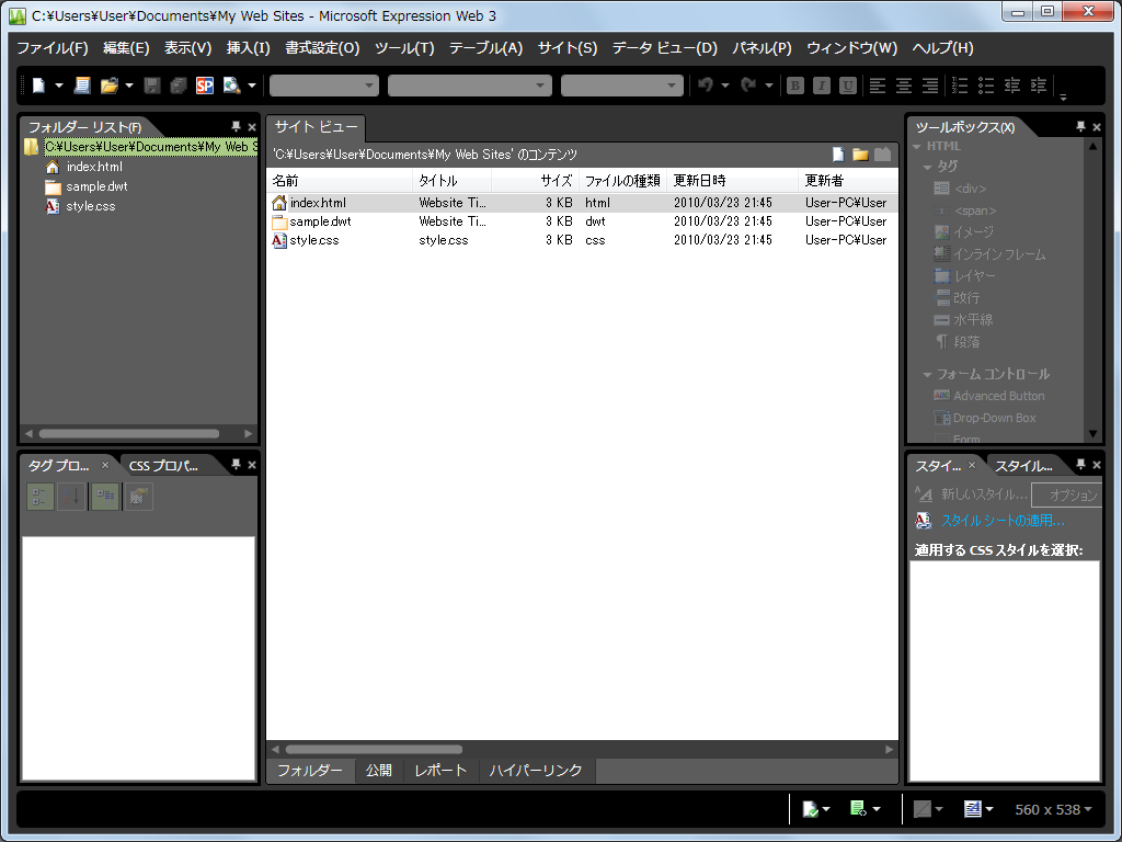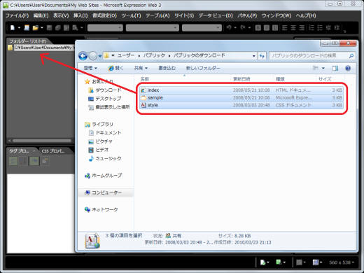 - [フォルダーリスト]パネルまでドラッグ&ドロップすると、選択されたファイルが作業中のサイトにインポートされます。