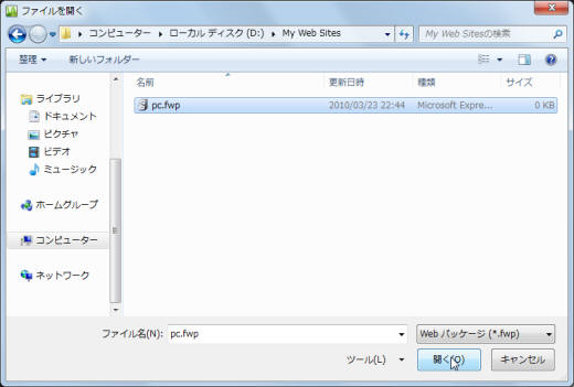 - [ファイルを開く]ダイアログボックスが表示されます。Webパッケージファイル(拡張子.fwp)を選択して、[開く]ボタンをクリックします。