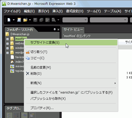 - [フォルダーリスト]パネルから、サブサイトに変換したいフォルダを右クリックして[サブサイトに変換]をクリックします。