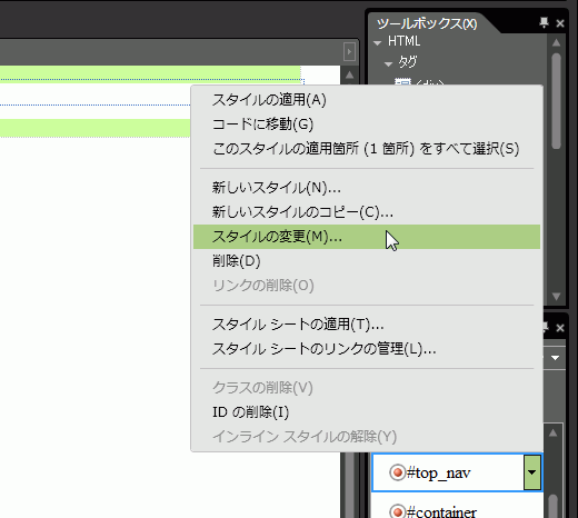 - 「#top_nav」を右クリックして[スタイルの変更]をクリックします。
