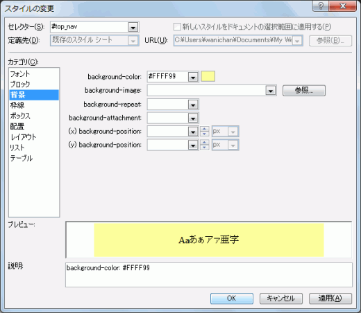- [background-color]プロパティに色を指定して[OK]ボタンをクリックします。
