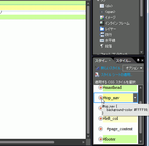 背景色を指定する方法は、『ヘッダーやフッターなどの背景色を変更するには』ですでに触れました。Expression Webの組み込みCSSレイアウトテンプレートにおいて、ナビゲーションエリアのスタイルの名前は「#top_nav」です。この背景色を設定しましょう。