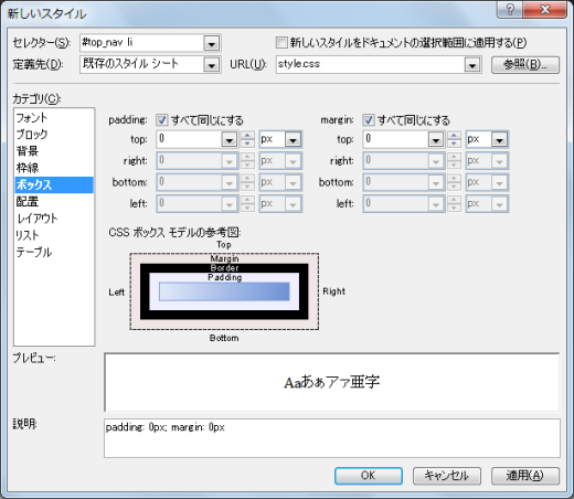 - [ボックス]カテゴリを開き、下の図のようにパディングとマージンを0ピクセルにします。