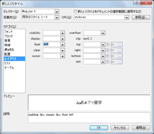 - [レイアウト]カテゴリを開き、横並びにするために[float]プロパティを「left」にします。