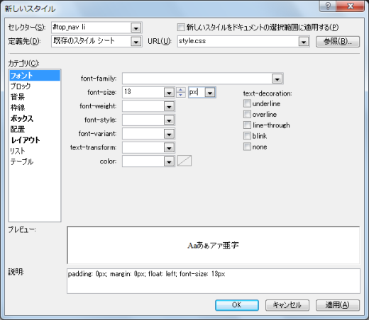 - [定義先]は「既存のスタイルシート」、URLは「style.css」が選択されていることを確認します。