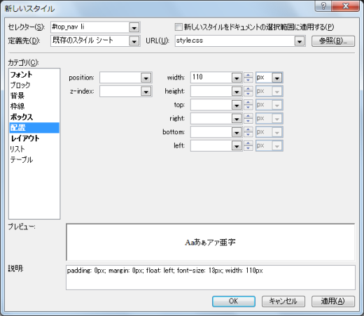 - それぞれの項目の幅を固定するには、[配置]カテゴリを開き、[width]プロパティに幅の値を指定します。110ピクセルの場合は以下のとおりです。