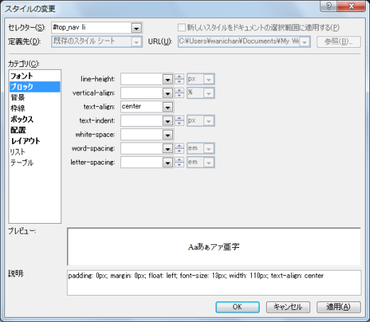 - それぞれの幅を固定した場合に文字をセンタリングする場合は[ブロック]カテゴリを開き、[text-align]プロパティを「center」にして、[OK]ボタンをクリックします。