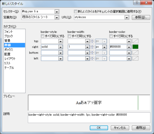 - 枠線スタイルを指定します。ここでは、右辺に1ピクセルの実線を引きます。枠線のスタイルはborder-style、枠線の太さはborder-width、枠線の色はborder-colorプロパティで設定します。それぞれの[すべて同じにする]のチェックをはずしてそれぞれの[right]に値を指定します。実線は「solid」となります。