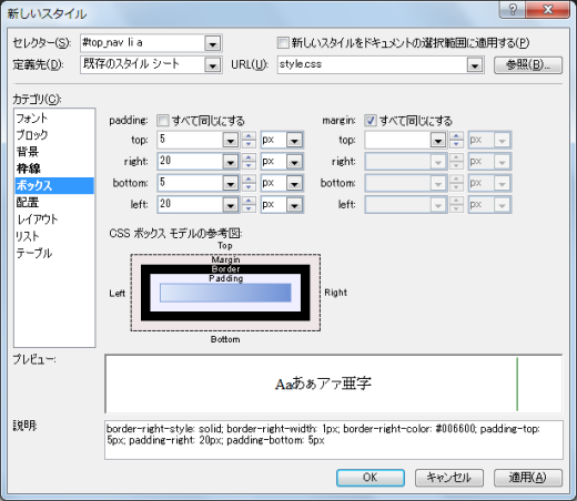 - 続いて、リスト項目のパディングを指定します。[ボックス]カテゴリを開き、paddingプロパティにそれぞれ値を入力します。ここでは[すべて同じにする]のチェックははずして下の図のように上下5ピクセル、左右20ピクセルに指定します。