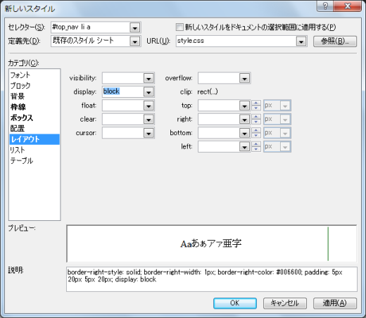 - リンクの文字だけなく項目全体をリンク対象にするために、[レイアウト]カテゴリを開いて[display]プロパティを「block」にします。