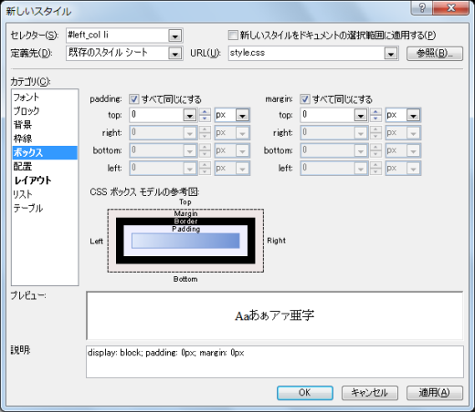 - マージンとパディングを0にします。[ボックス]カテゴリを開き、marginプロパティおよびpaddingプロパティを0pxにします。
